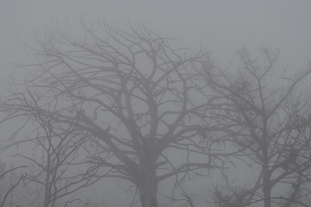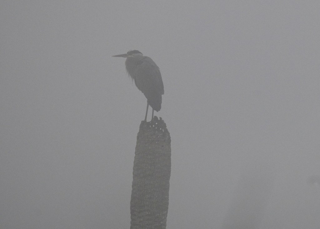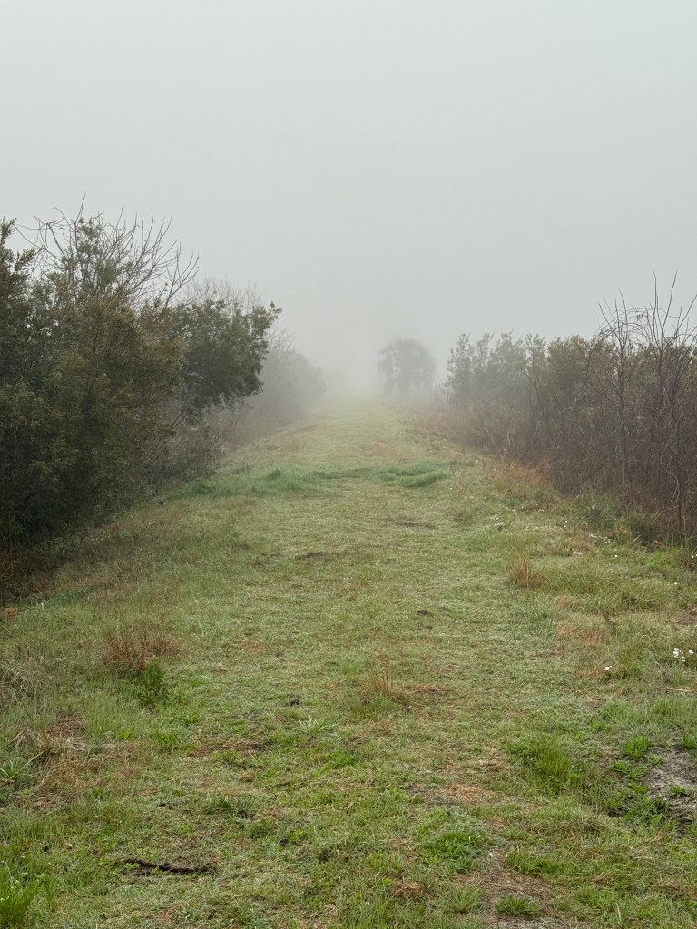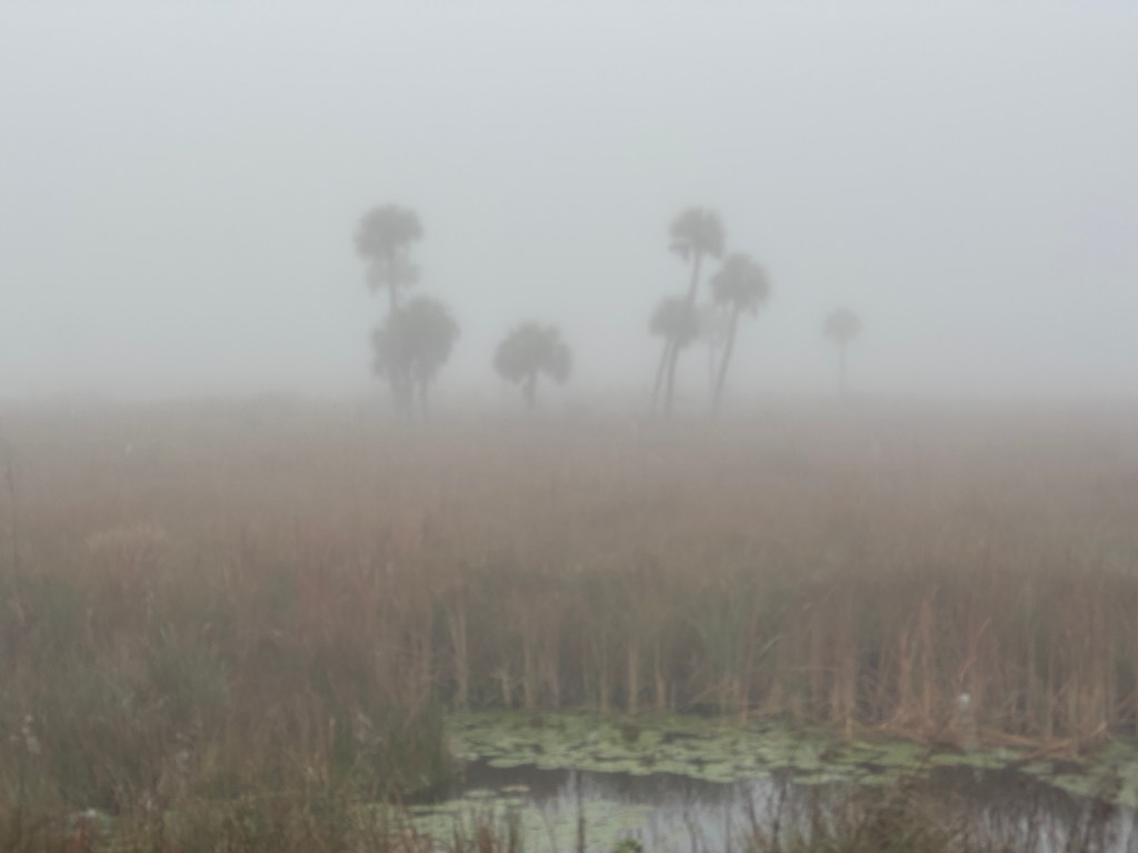 I arrived in the wildlife refuge without the fanfare of a brilliant sunrise on this trip. No crimson rays streaking across the marshes. No flurry of animal activity as the radiant orb rose. I was not greeted this time by a large otter trotting across the access road. What I was greeted by was a stifling, thick shroud of fog. Visibility was seriously reduced as the photos show and the fog seemed to suppress all sounds except the Red Winged Black Birds who chattered away all over the wetlands. My footfalls were soft on the dew laden ground and moisture dripped from the brim of my ball cap as I hiked. There was no noise but the chatty black birds and the quiet sound of the electronic stutter on my camera.