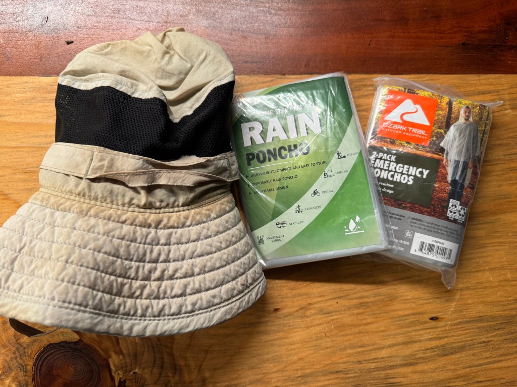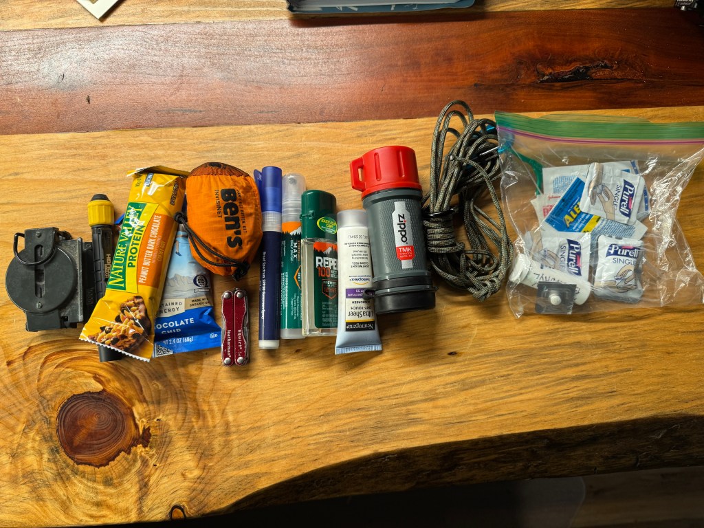 I’m bald. So I always carry an extra hat. I carry two cheap emergency ponchos. I can cover myself, a friend, make a shelter., or both if need be. They weigh nothing and will help keep me and my camera dry for a single use. I carry a compass, small flashlight, food, water (not shown) bug net (in orange bag and a small multi-tool. I carry plenty of insect repellant and sunscreen (where I live you better have both in quantity), a way to reliably start fire, a length of quality paracord and basic medical. The basic medical includes Band Aids, aspirin, antihistamine, alcohol wipes and various other stuff for minor boo-boos. Over and above that, I carry a fully charged cell phone and a sharp high quality pocket knife. All this may seem like a lot, but after years of doing this, years of first responder work and a fair bit of research its what I settled on when I go places where help is not just a call away.