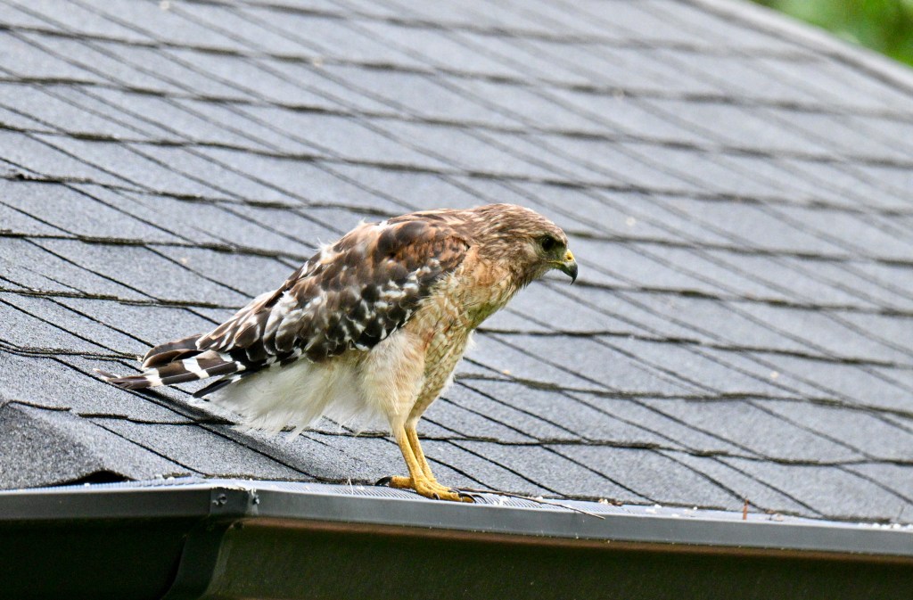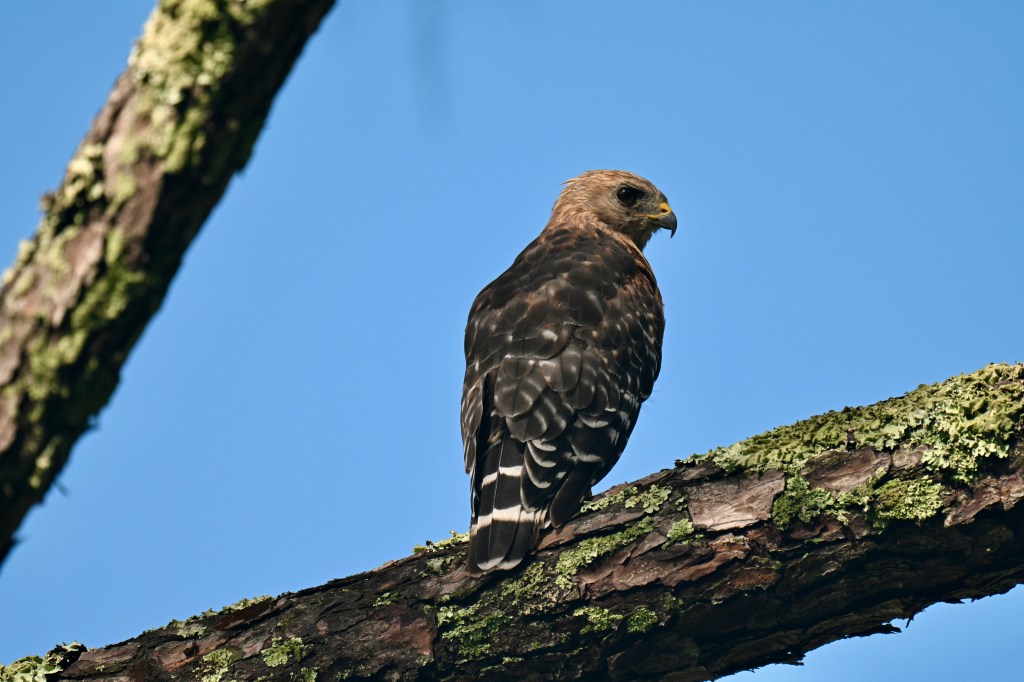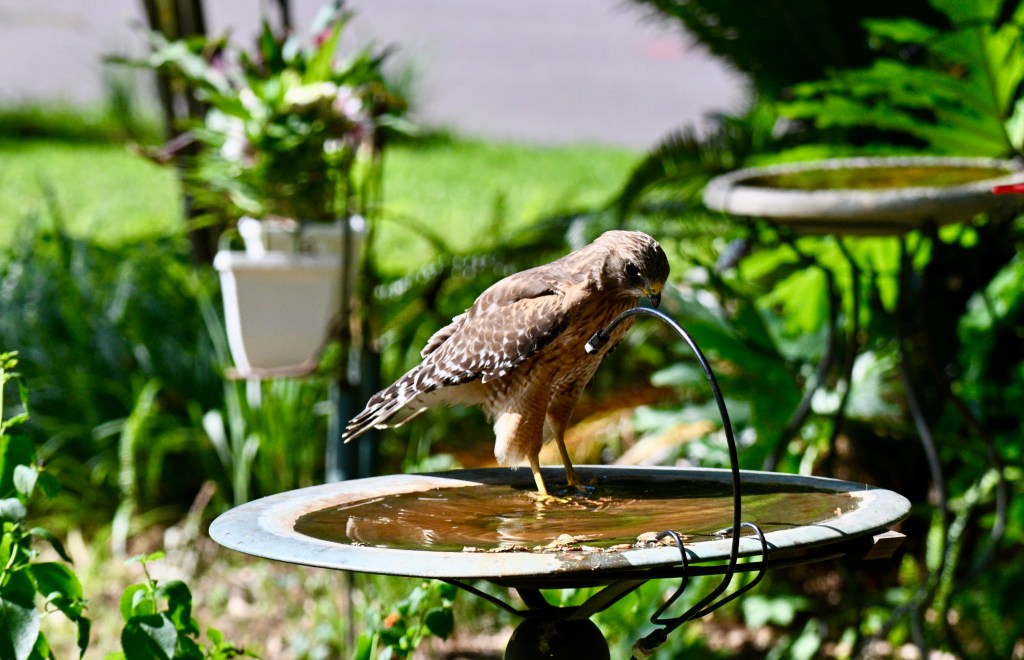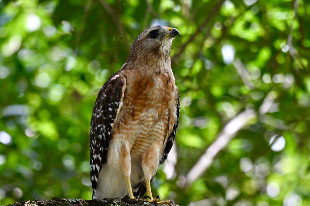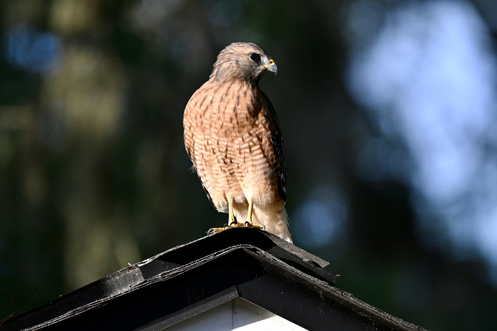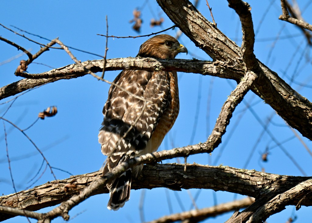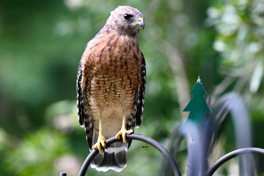 Red Shouldered Hawks are probably the most commonly seem raptor in my area. They can be beautiful, regal and very tolerant. They hunt small mammals, retiles, amphibians and insects and usually mate for life. The females are larger than the males. The pair in my neighborhood frequent my yard, have treated the my pond (frogs) like a buffet and the female is quite tolerant of me and the camera. The male…not so much. Double click on each image to enlarge and scroll.