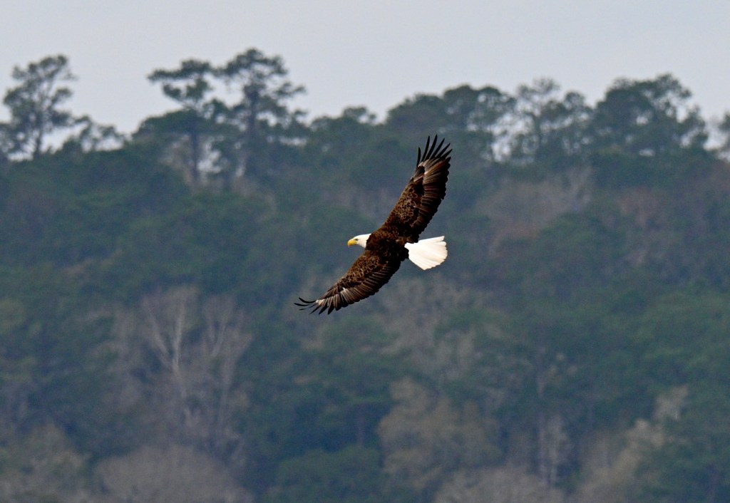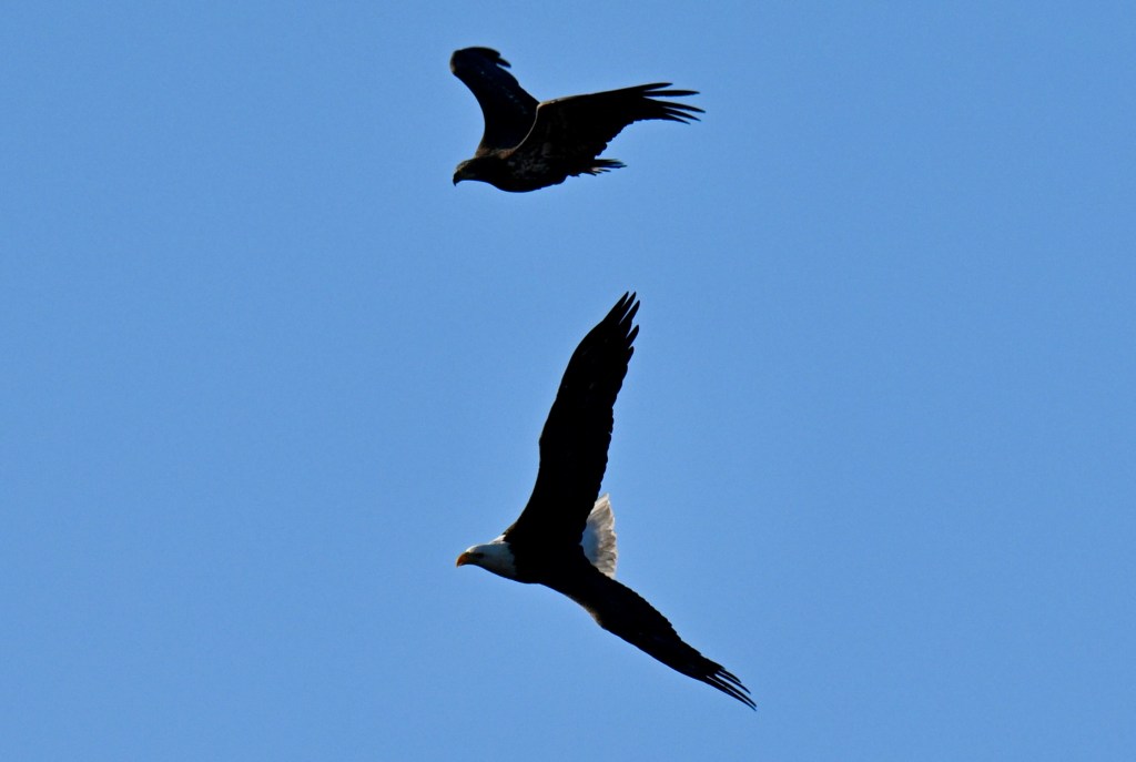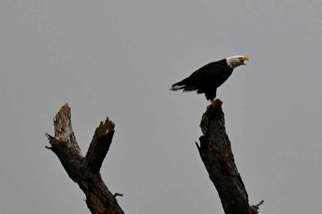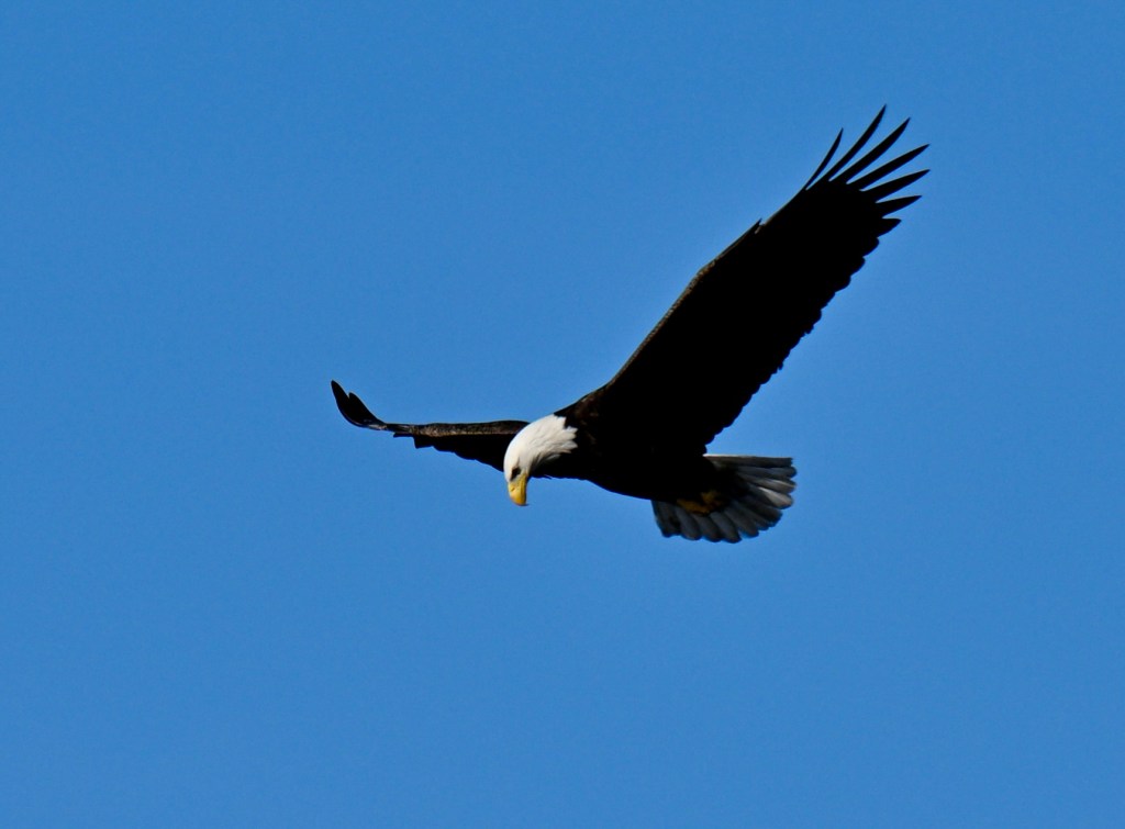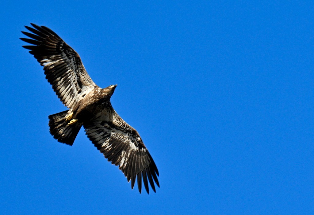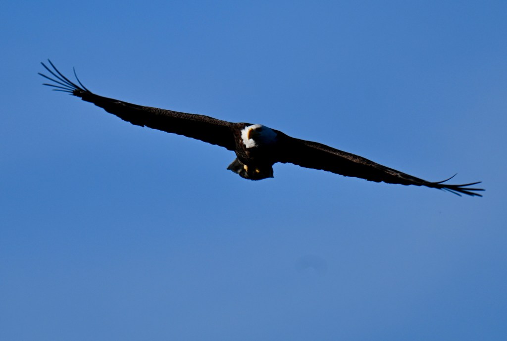The Bald eagle is an immense bird. The wingspan of an adult can reach just over seven feet. Think about it. A wingspan that is wider than most NBA players are tall. Having had close encounters with them in the wild, I can attest to the fact that they are tall when perched as well. We are all familiar with the black and white coloring of adults. Sub-adults have a mottled brownish coloring that lends its self to camouflage better. Females are notably larger than the males.