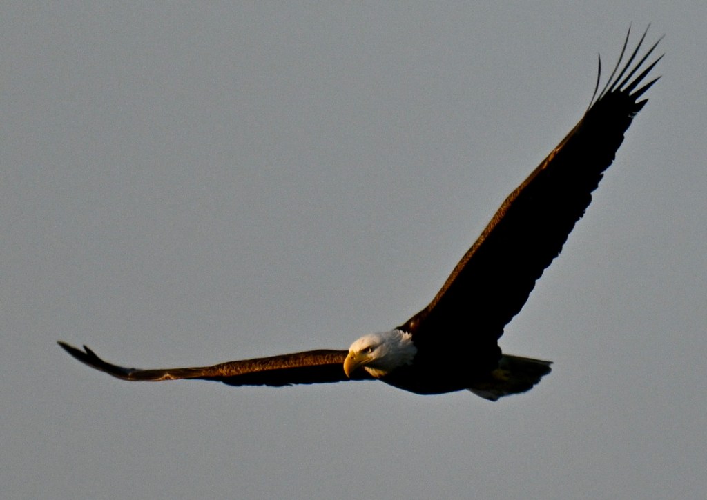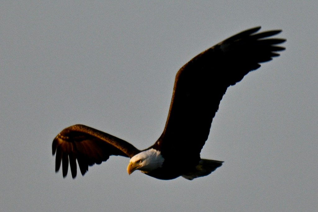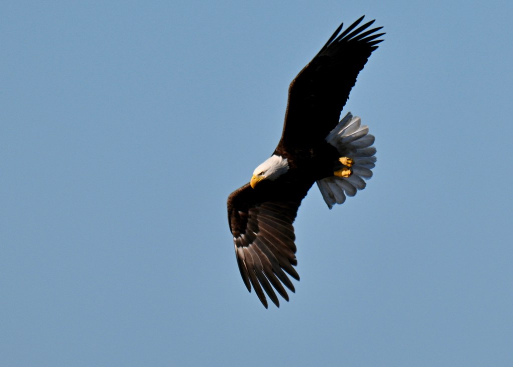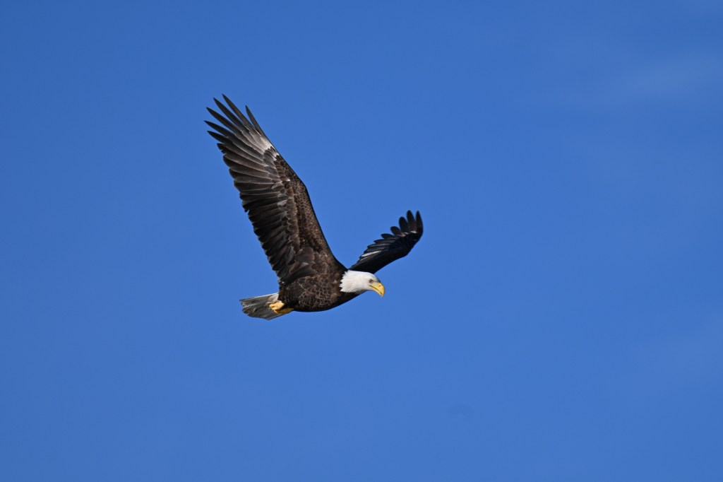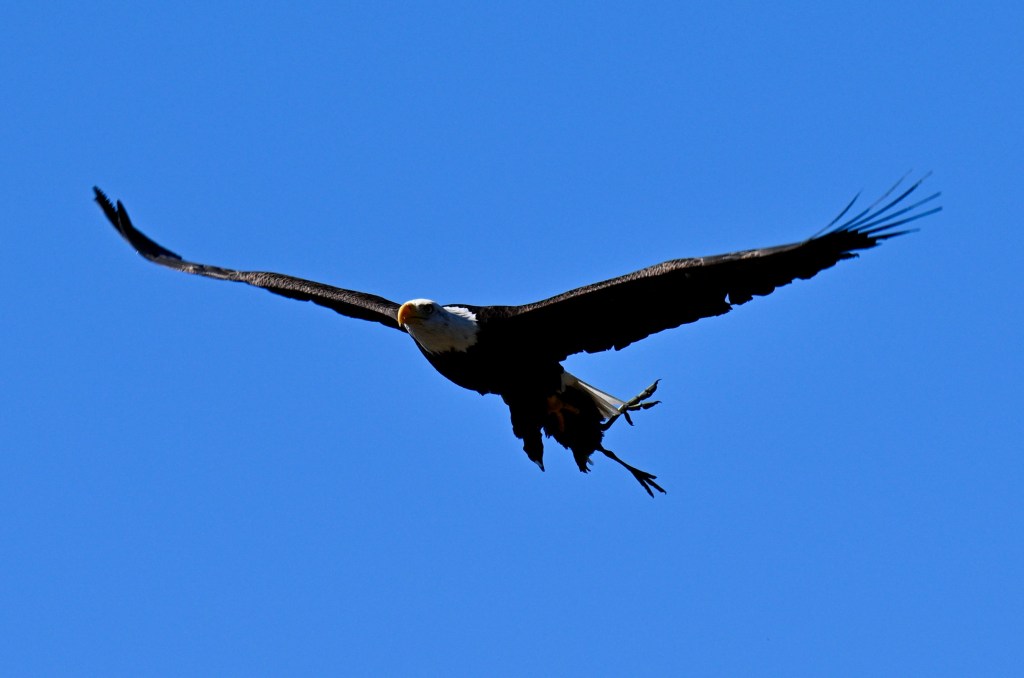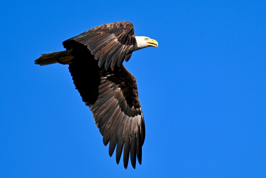 The Bald eagle is an immense bird. The wingspan of an adult can reach just over seven feet. Think about it. A wingspan that is wider than most NBA players are tall. Having had close encounters with them in the wild, I can attest to the fact that they are tall when perched as well. We are all familiar with the black and white coloring of adults. Sub-adults have a mottled brownish coloring that lends its self to camouflage better. Females are notably larger than the males.