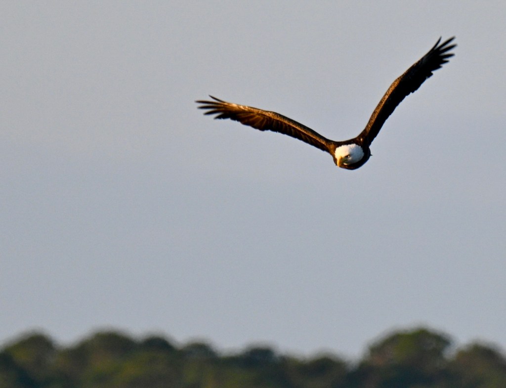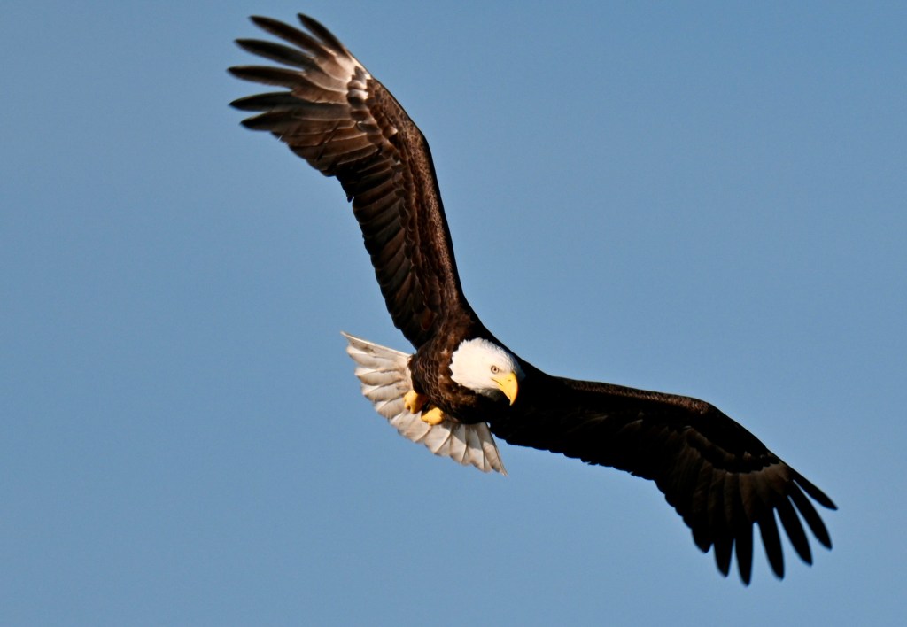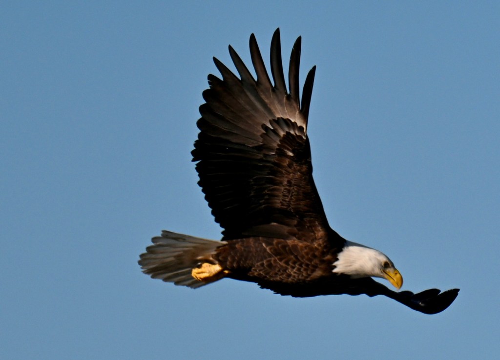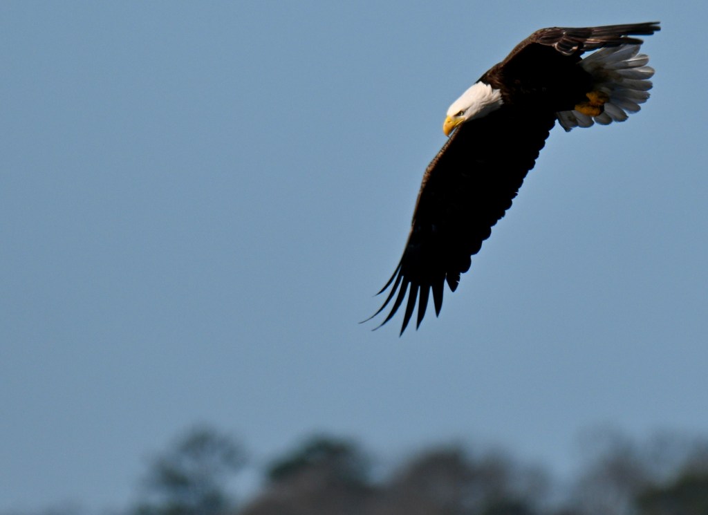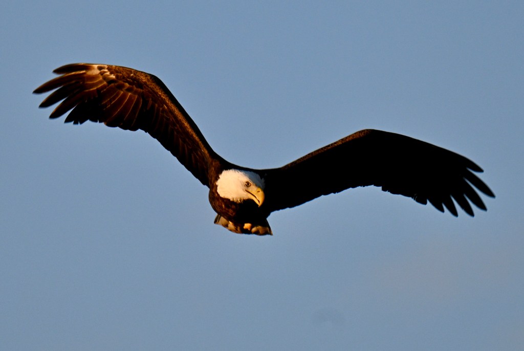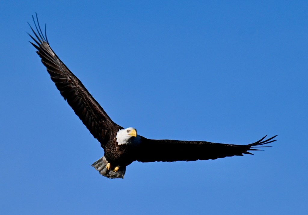 The Bald eagle is an immense bird. The wingspan of an adult can reach just over seven feet. Think about it. A wingspan that is wider than most NBA players are tall. Having had close encounters with them in the wild, I can attest to the fact that they are tall when perched as well. We are all familiar with the black and white coloring of adults. Sub-adults have a mottled brownish coloring that lends its self to camouflage better. Females are notably larger than the males.