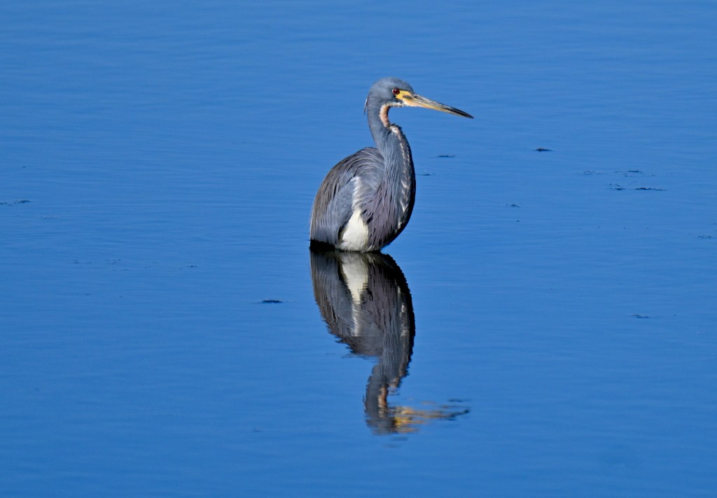 A tricolored Heron stalks its breakfast in the glassy waters.
