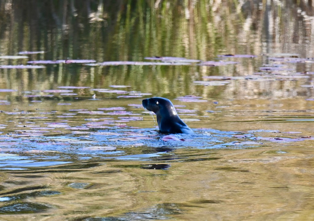 The first otter surprises me, crossing right in front of me into the morning sun.