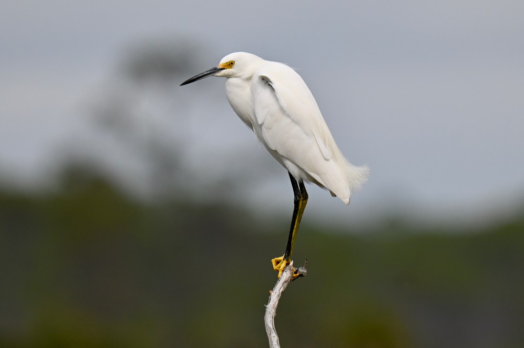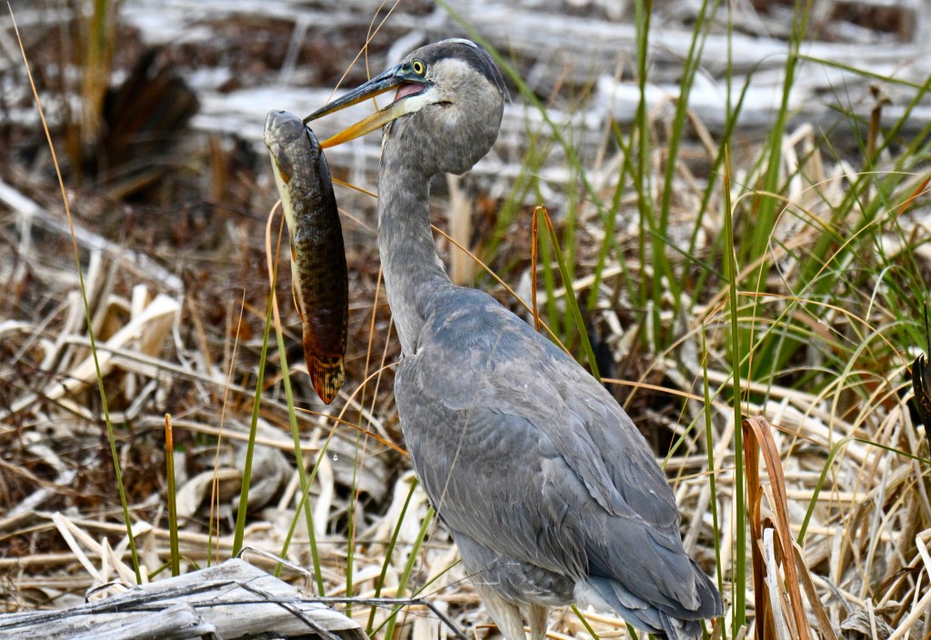 Left to right, top to bottom: A great blue heron speared a LARGE breakfast. One of hundreds of alligators basks in the morning sun. Yet another otter darts across the levy with a large fish in its mouth. A bald eagle landed atop a dead tree and announces its presence to the refuge and a snowy egret poses for me by the road.