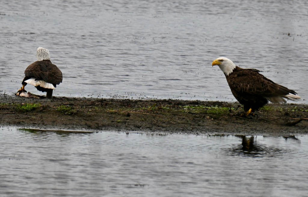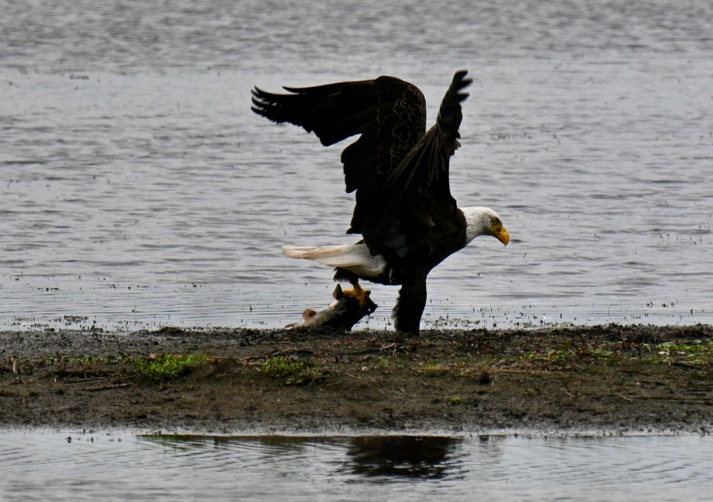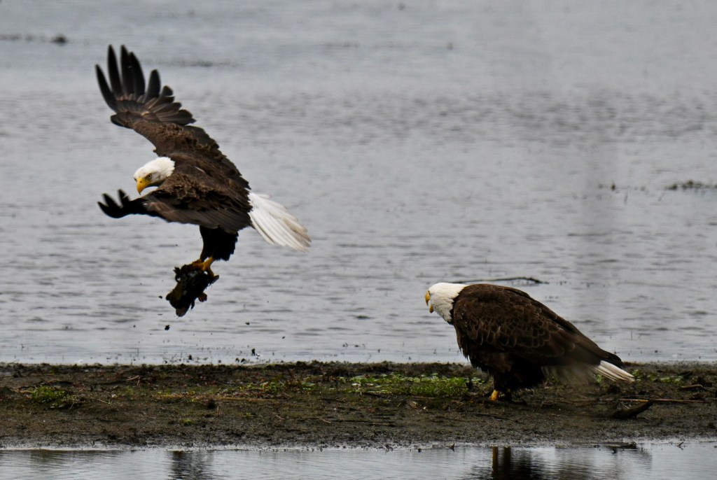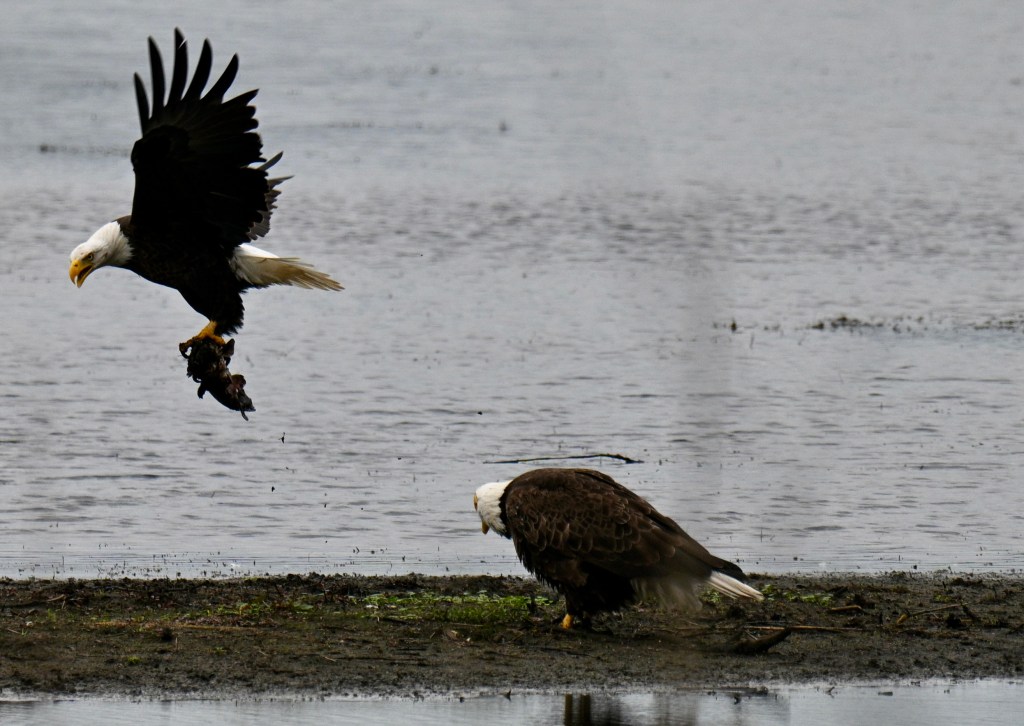 Back a third time on an overcast day that was less than ideal for photography, one of the pair (later realized it was the male) circled overhead twice and dove on something in the shallows near my location. This time he came up with a huge bass and hauled it out of the water to a nearby mud bar. Once there, his female counterpart arrived and a squabble erupted. The female clearly wanted the fish and he was having none of it. Eventually, she backed off and stood by watching the smaller male try to take off with the huge fish with a smug look on her feathered face. Eventually, he managed it. She flew to some nearby grass (I think she was wiping mud off her talons) and then flew after him presumably to try to share the sushi elsewhere.