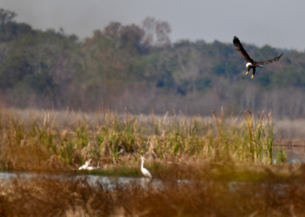 On the hunt! An adult swoops in over a large raft of American Coot on what’s left of Lake Jackson recently, makes the kill and flies right over my head with it’s breakfast dangling behind it in the wind.Parental joy! In the same area, I saw two eagles approaching and threw up the camera. It turned out to be an adult and pre-adult. I thought they might be hunting but instead caught teenage horseplay! Lower right hand frame is a good shot of the teenager..Beautiful Fury-Saint Marks Wildlife Refuge
